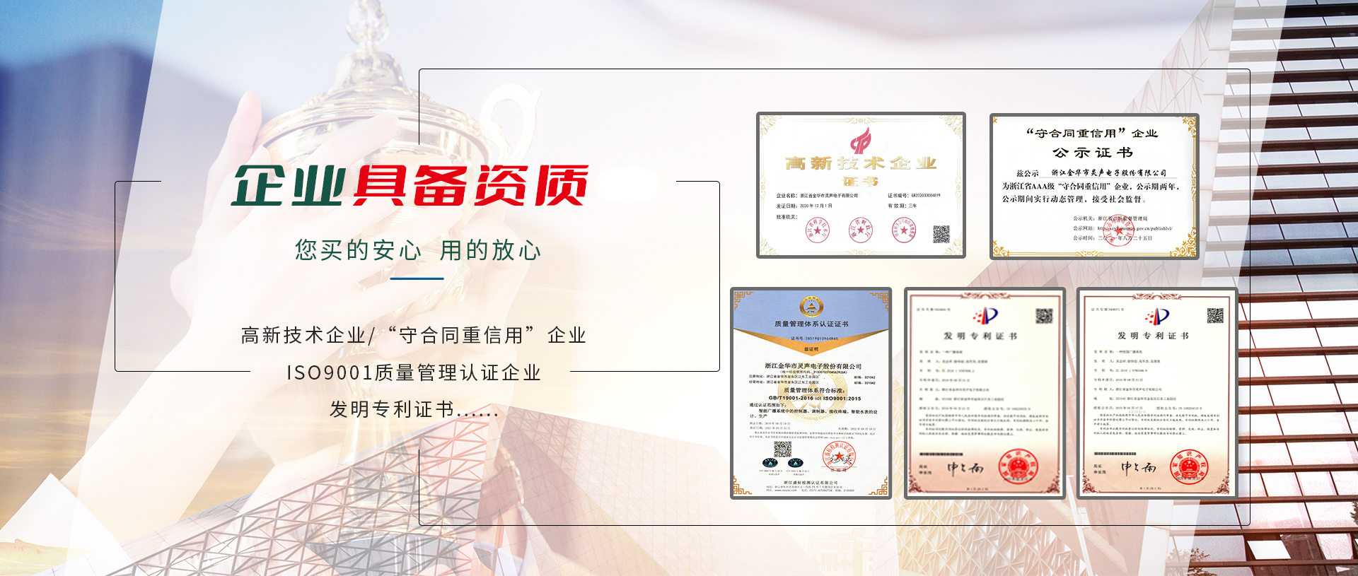 公司2001年通過ISO9001:2008國際質(zhì)量管理體系認(rèn)證、ISO14001:2004環(huán)境管理體系認(rèn)證,相關(guān)產(chǎn)品通過國家CCC認(rèn)證及CQC產(chǎn)品質(zhì)量認(rèn)證,并通過國家廣播電影電視新聞出版總局廣播電視設(shè)備器材入網(wǎng)認(rèn)可。公司注重產(chǎn)品的質(zhì)量與技術(shù)創(chuàng)新,現(xiàn)建有多條先進(jìn)的總裝、檢測流水生產(chǎn)線及各項(xiàng)檢測設(shè)備所需的儀器設(shè)備。還擁有全電磁屏蔽室一個(gè),所有高頻產(chǎn)品的調(diào)試均在屏蔽室中進(jìn)行。公司組建了高素質(zhì)的管理隊(duì)伍,設(shè)有研發(fā)部、生產(chǎn)部、銷售部、采購部、質(zhì)檢部、售后服務(wù)中心及財(cái)務(wù)部等部分,并與國內(nèi)多家大專院校、科研單位建立長期合作關(guān)系,成立了近乎是技術(shù)研發(fā)中心,是金華市職業(yè)技術(shù)學(xué)院重點(diǎn)示范實(shí)習(xí)基地。公司產(chǎn)品先后被浙江、江蘇、重慶、四川、甘肅、山東、湖南、湖北、貴州等文廣新局、電視臺、氣象局普遍采用,覆蓋全國各省市800多家縣(市)文廣新局、廣播電視臺,并廣泛采用于教育行業(yè),尤其是在近年來的農(nóng)村應(yīng)急廣播“村村響”工程中,靈聲公司中標(biāo)承建的“村村響”工程贏得了各省市廣播電視劇領(lǐng)導(dǎo)、專家們的一致好評!